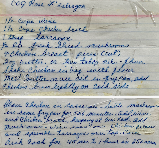Eight handwritten recipes from Nana’s recipe file correspond to chicken recipes on the website. A link to the original recipe has been added to the bottom of each of the eight recipes.