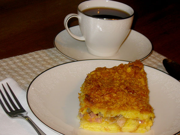 When ready to bake, place crushed corn flakes on top of bread and pour melted butter evenly over corn flakes. Bake at 325° for 1 hour.