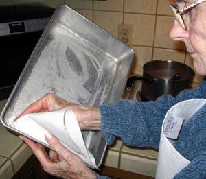 3 Grease a 10x14-inch pan by rubbing a small piece of butter onto the surface of the pan. Use a piece of paper towel to keep your hands clean. If you prefer a thicker piece of fudge use a 9x13-inch pan. |